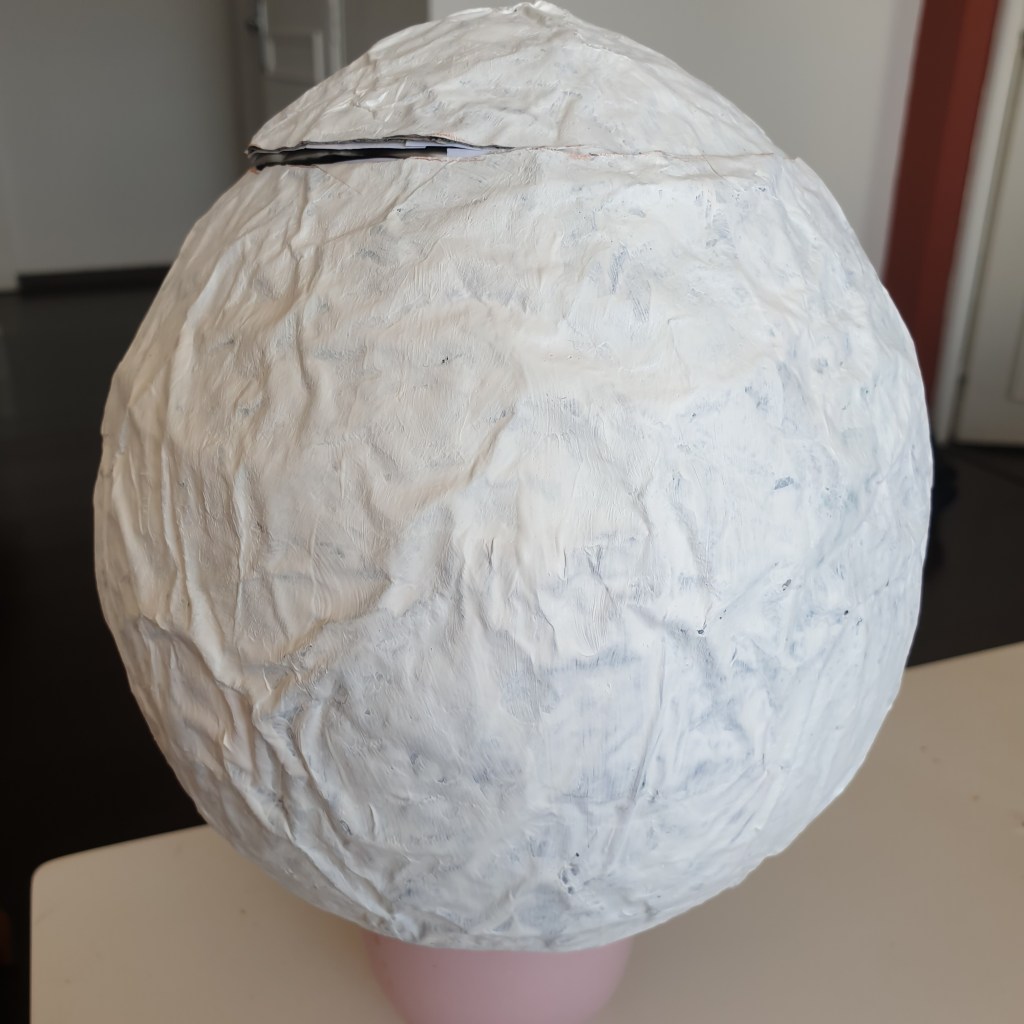 - Coller des bandes de papier journal sur toute la surface du ballon. Faire plusieurs couches afin qu’en séchant, l’œuf devienne bien dur. Laisser le nœud du ballon apparent.