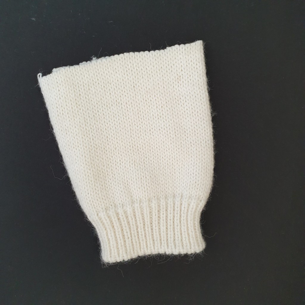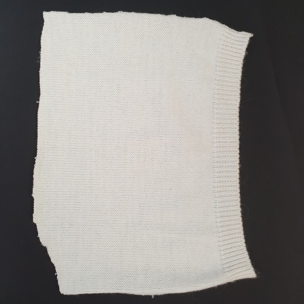 8. Couper le corps du pull qui servira à recouvrir l’œuf: on garde le bord côtes en bas du pull. Ce bord permettra d’obtenir une finition nette.