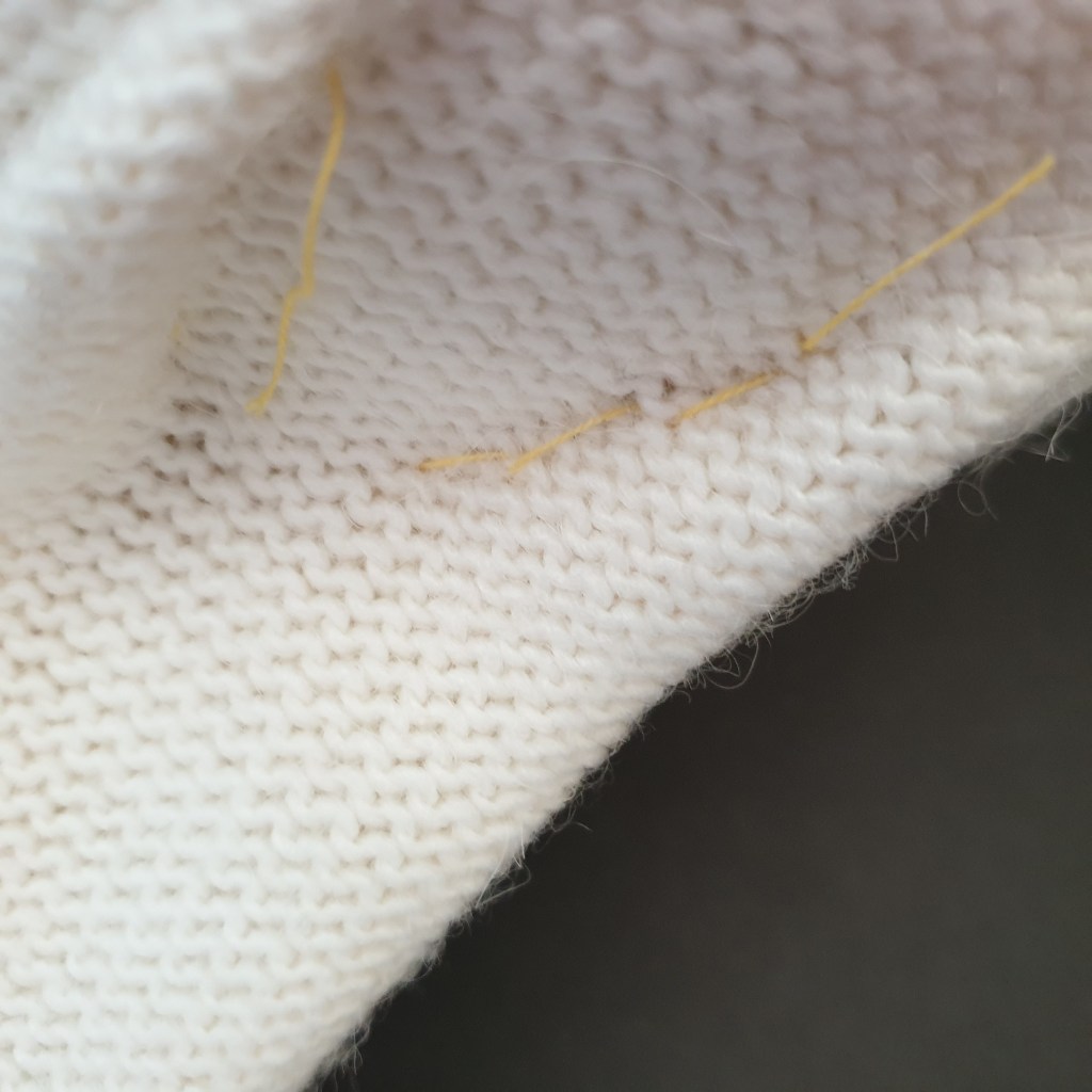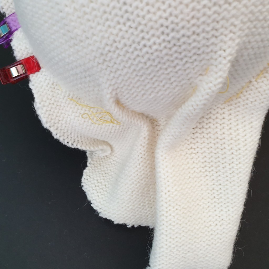 12. Retirer le pull de l’œuf et coudre l’enveloppe en suivant les points de bâti. Couper l’excédent de tissu des pinces.