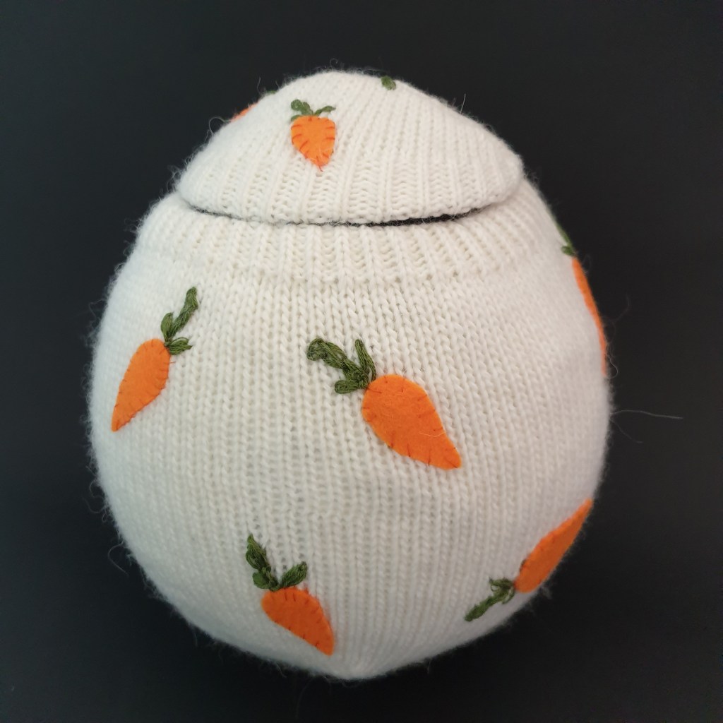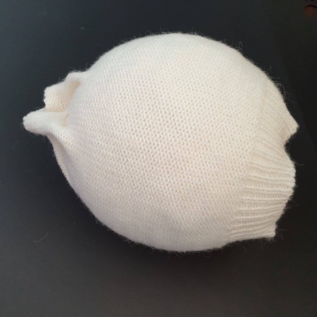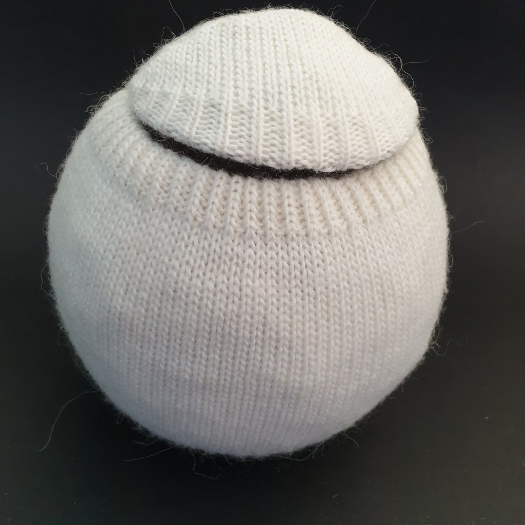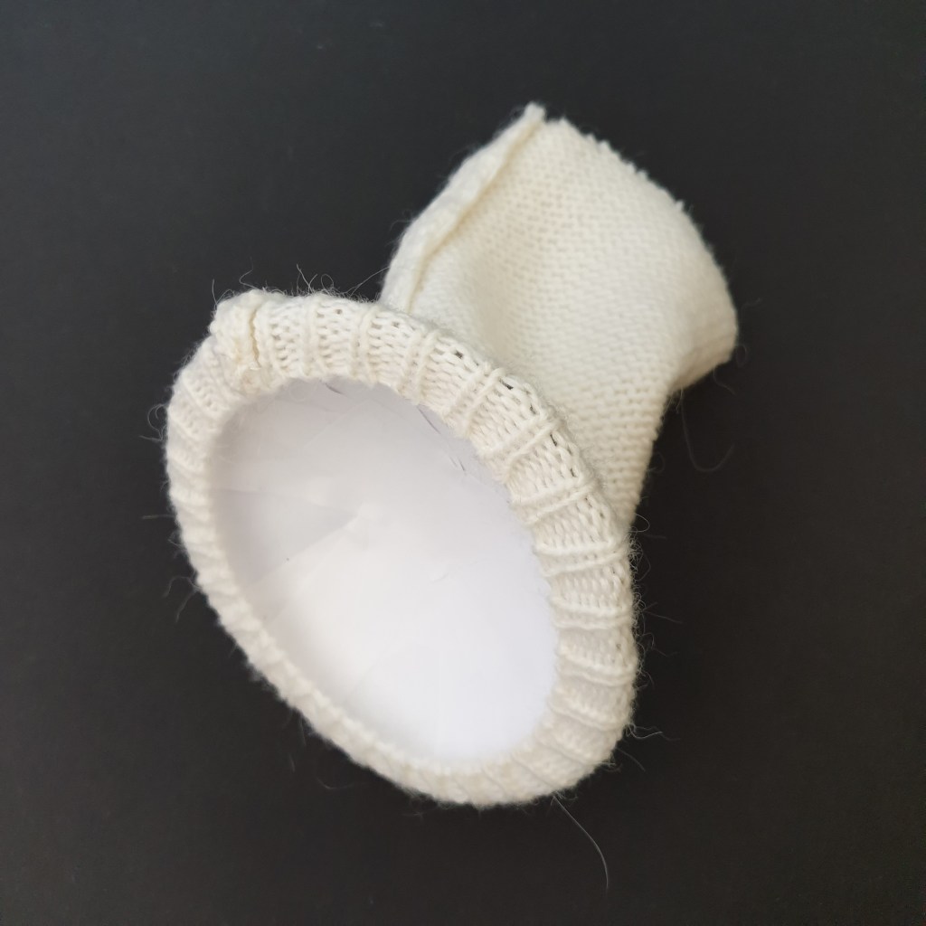 9. Retourner le pull sur l’envers et l’arranger autour de la partie basse de l’œuf. Le bord côte rentre à moitié dans la coquille.